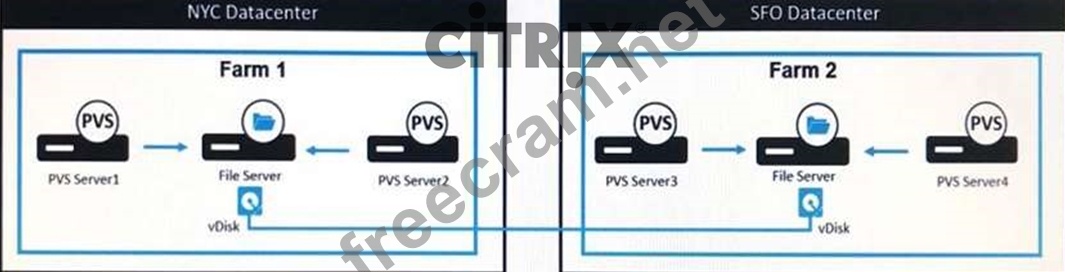 Scenario: A Citrix Architect needs to design a multi-datacenter XenApp and XenDesktop environment that will use Provisioning Services (PVS) to manage Virtual Delivery Agent (VDA) machine images. Each datacenter will have a separate Provisioning Services farm. During the design discussions, the architect creates a diagram to depict the way vDisk files will be replicated between PVS farms, based on the available storage for the vDisk Stores.