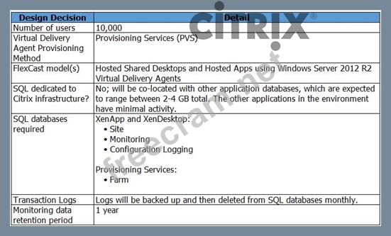 Scenario: A Citrix Architect needs to design a single-Site XenApp and XenDesktop environment. Through earlier design discussions, the architect has determined the environment details listed in the Exhibit. Click the Exhibit button to view the details. Which SQL server baseline specifications will provide acceptable performance and stability while avoiding unnecessary over-provisioning of resources?