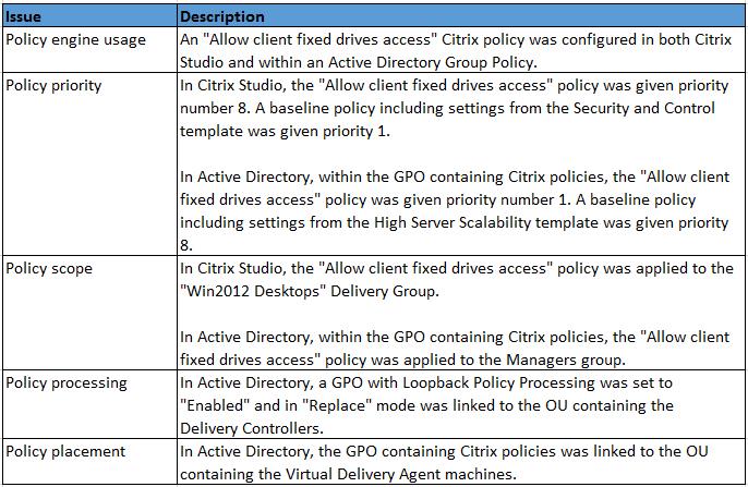 However, testing verifies that users from the Managers group are NOT able to view their endpoint's drives from within their session. While verifying the policy settings, the architect notes several misconfigurations.