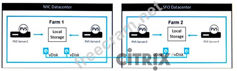Scenario: A Citrix Architect needs to design a multi-datacenter XenApp and XenDesktop environment that will use Provisioning Services (PVS) to manage Virtual Delivery Agent (VDA) machine images. Each datacenter will have a separate Provisioning Services farm. During the design discussions, the architect creates a diagram to depict the way vDisk files will be replicated between PVS farms, based on the available storage for the vDisk Stores.