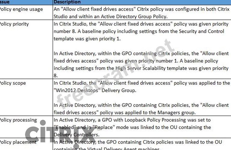However, testing verifies that users from the Managers group are NOT able to view their endpoint's drives from within their session. While verifying the policy settings, the architect notes several misconfigurations.
