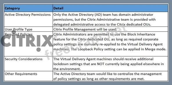 Scenario: A Citrix Architect needs to design a new XenApp and XenDesktop environment. Click the Exhibit button to view information collected by the architect during the Resource Layer discussions. Based on the requirements, the Citrix Administrative team should use _______to manage Citrix policies and __________ to manage Microsoft settings. (Choose the correct option to complete the sentence.)