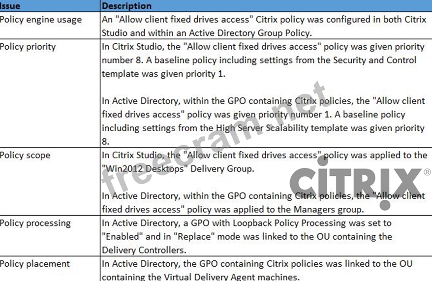 However, testing verifies that users from the Managers group are NOT able to view their endpoint's drives from within their session. While verifying the policy settings, the architect notes several misconfigurations.