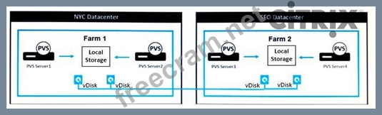 Scenario: A Citrix Architect needs to design a multi-datacenter XenApp and XenDesktop environment that will use Provisioning Services (PVS) to manage Virtual Delivery Agent (VDA) machine images. Each datacenter will have a separate Provisioning Services farm. During the design discussions, the architect creates a diagram to depict the way vDisk files will be replicated between PVS farms, based on the available storage for the vDisk Stores.