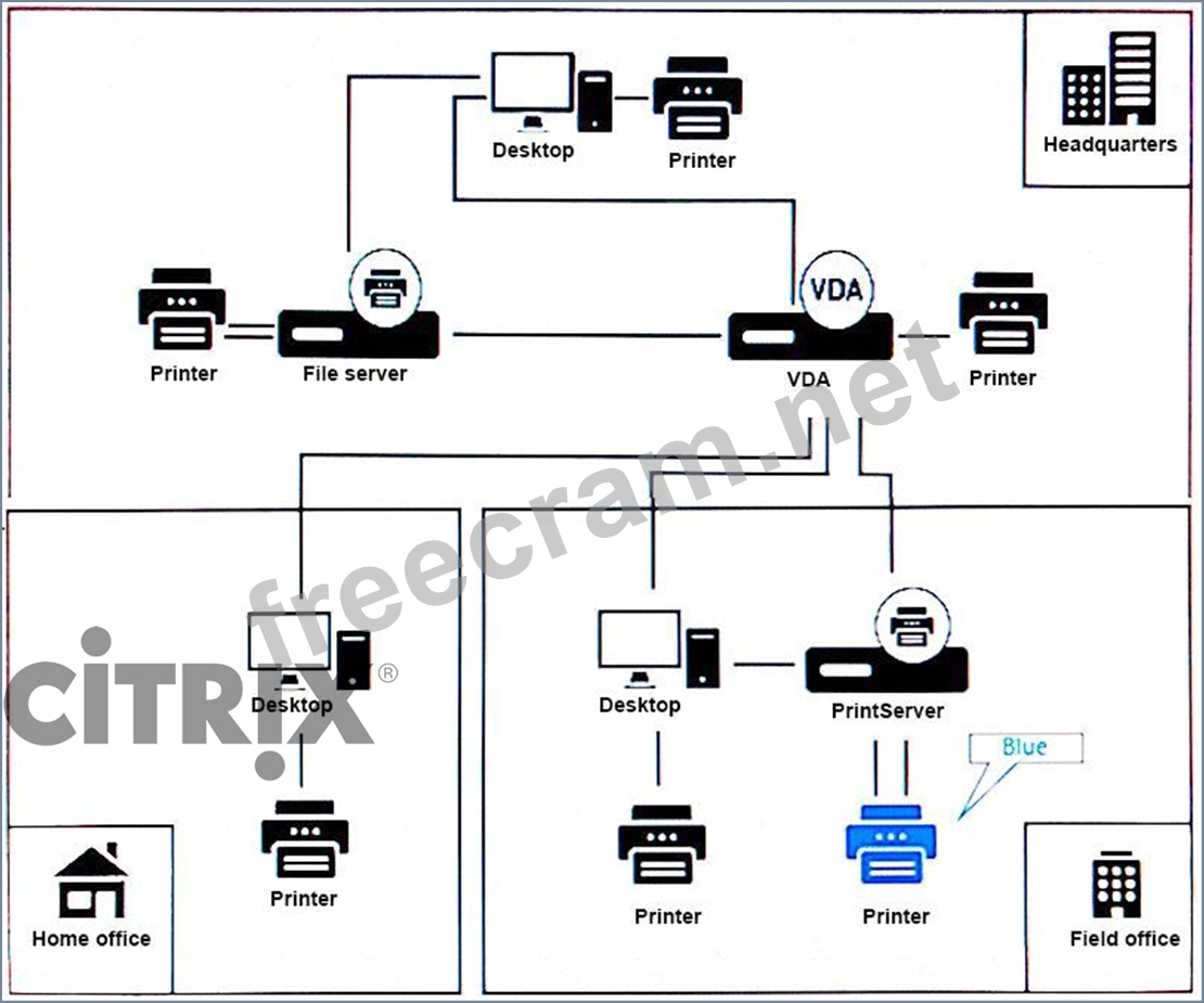 While setting up a new field office, the architect discovers that the printer marked in blue in the Exhibit is showing up in a user's session without the architect having configured any policies or printer mapping for this user or printer.