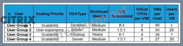The table in the Exhibit lists details about the requirements of the current user groups and their Virtual Delivery Agent (VDA) machine workloads.