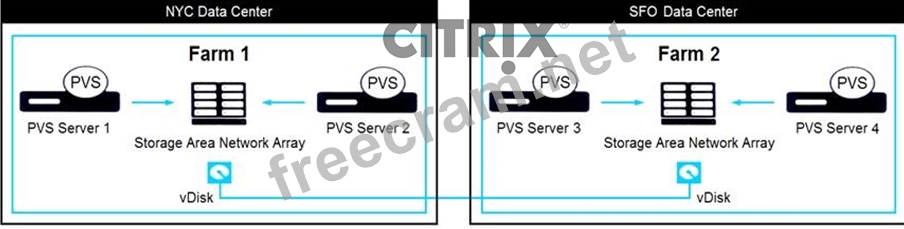 Scenario: A Citrix Architect is designing a multi-data center Citrix Virtual Apps and Desktops environment that will use Citrix Provisioning (PVS) to manage Virtual Delivery Agent (VDA) machine images. Each data center will have a separate PVS farm. During design discussions, the architect created a diagram to depict the way in which vDisk files will be replicated among PVS farms, based on the available storage for the vDisk stores.