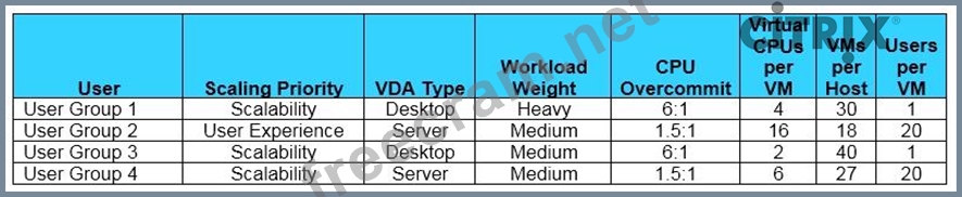 The table in the exhibit lists details about the requirements of the current user groups and their Virtual Delivery Agent (VDA) machine workloads.