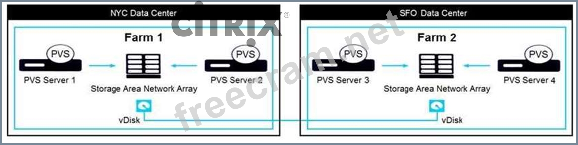 Scenario: A Citrix Architect is designing a multi-data center Citrix Virtual Apps and Desktops environment that will use Citrix Provisioning (PVS) to manage Virtual Delivery Agent (VDA) machine images. Each data center will have a separate PVS farm. During design discussions, the architect created a diagram to depict the way in which vDisk files will be replicated among PVS farms, based on the available storage for the vDisk stores.