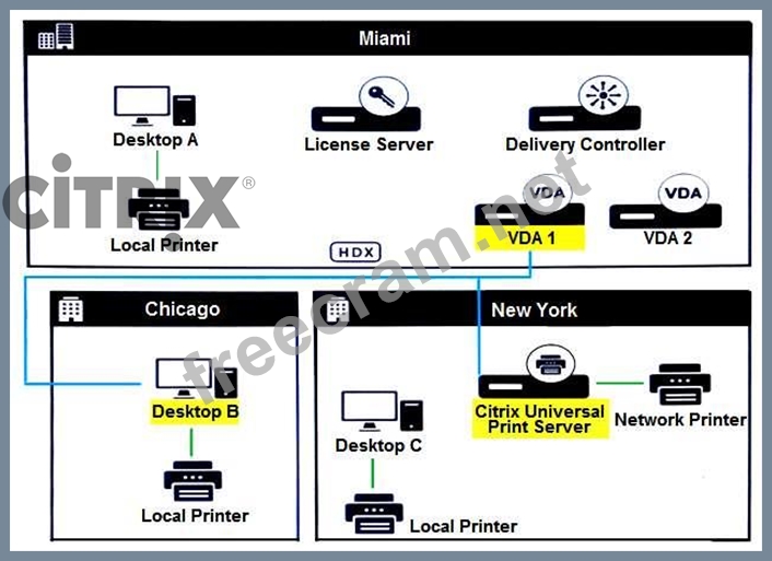 Scenario: A Citrix Architect is designing a new Citrix Virtual Apps and Desktops environment for a company that maintains branch offices in New York, Chicago, and Miami. Management has described the following requirements for the environment: * The Citrix Virtual Apps and Desktops Site must be located in the company headquarters in Miami. * All users will only need to access their default local print queue from within their HDX sessions. * Users in Chicago need access to printers hosted on a Citrix Universal Print Server located in New York. * Printing performance and bandwidth usage must be optimized where possible. * The environment must be highly available. * The auto-created client printer models must function with no additional configuration needed. Click the Exhibit button to review the printing requirements. What does the architect need to do to meet the printing requirements for the users in Chicago?