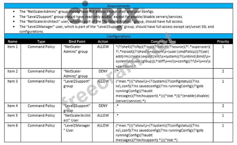 Scenario: A Citrix Architect needs to assess an existing Citrix ADC configuration. The customer recently found that members of certain administrator groups were receiving permissions on the production Citrix ADC appliances that do NOT align with the designed security requirements. Click the Exhibit button to view the configured command policies for the production Citrix ADC deployment.