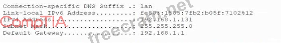 A user on a SOHO network is unable to watch online videos, even at 240 pixels. The technician runs ipconfig from the user's computer and records the following: