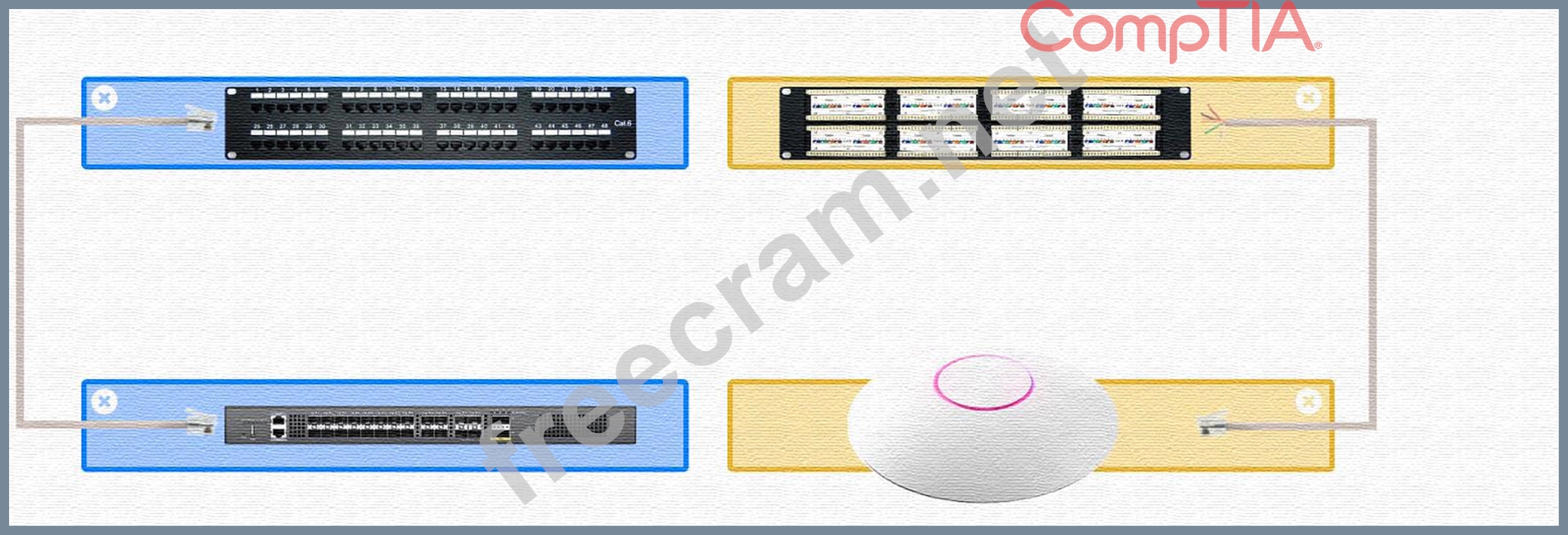 An access point was moved and no longer has connectivity. Connect the access point, patch panel, and switch by clicking the (+) to select the appropriate cable end for each corresponding location to create a link.