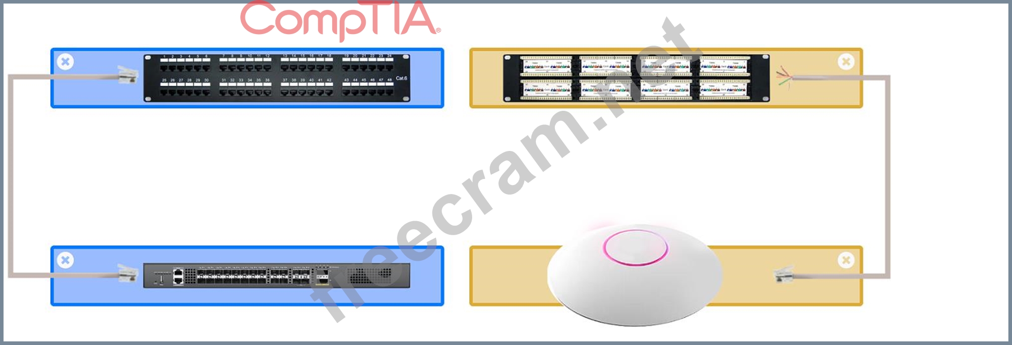 An access point was moved and no longer has connectivity. Connect the access point, patch panel, and switch by clicking the (+) to select the appropriate cable end for each corresponding location to create a link.