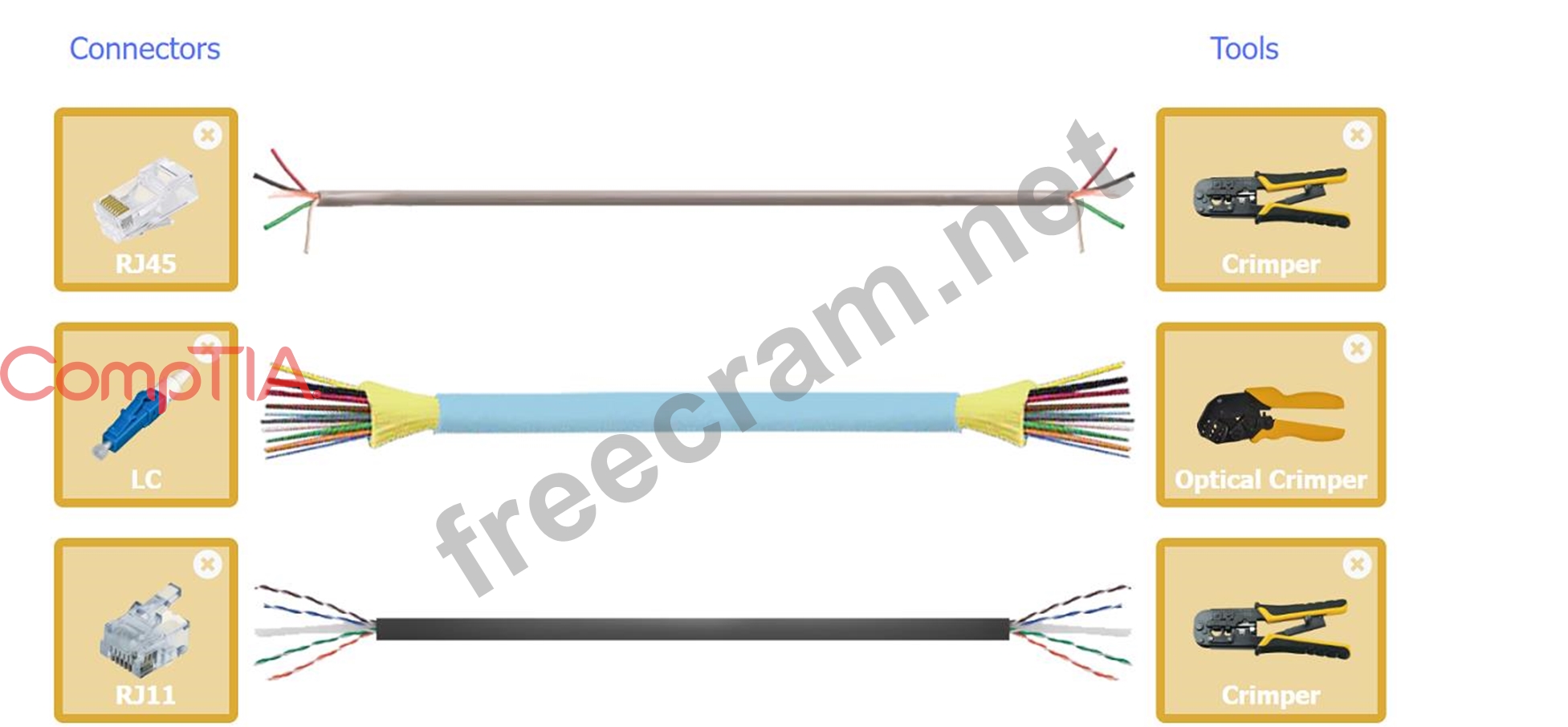 For each cable type, click the (+) to select the appropriate connector and tool.