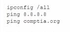 A user is unable to access the internet on a PC. A technician examines the PC and runs the following commands: