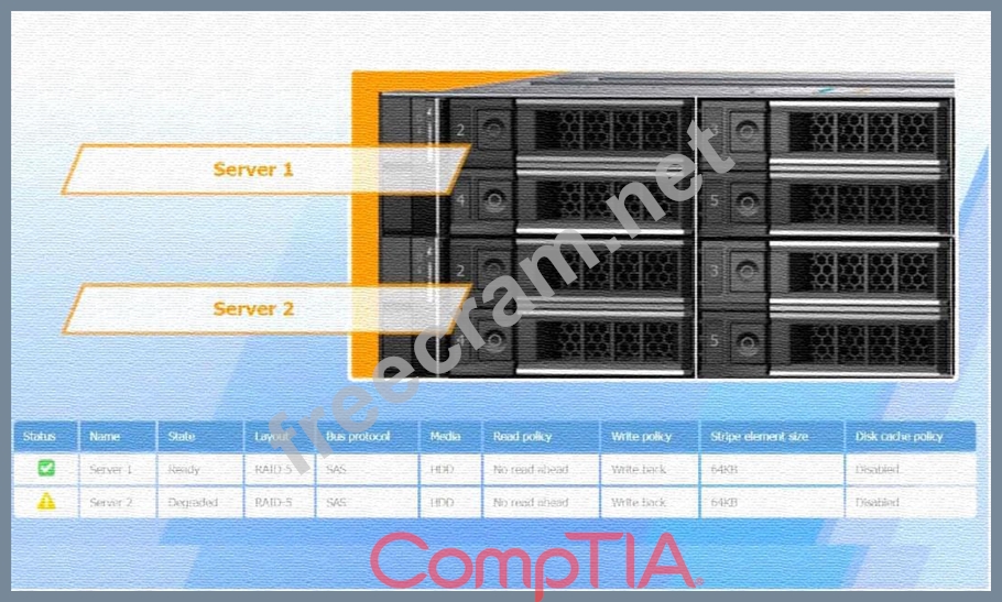 The degraded status on Server 2 indicates a RAID-5 issue, typically due to a failed or failing drive. In RAID-