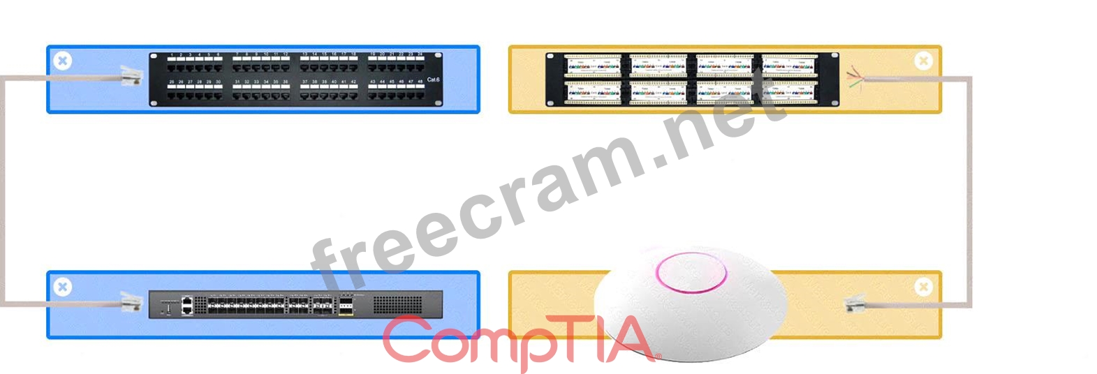 An access point was moved and no longer has connectivity. Connect the access point, patch panel, and switch by clicking the (+) to select the appropriate cable end for each corresponding location to create a link.
