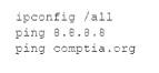 A user is unable to access the internet on a PC. A technician examines the PC and runs the following commands: