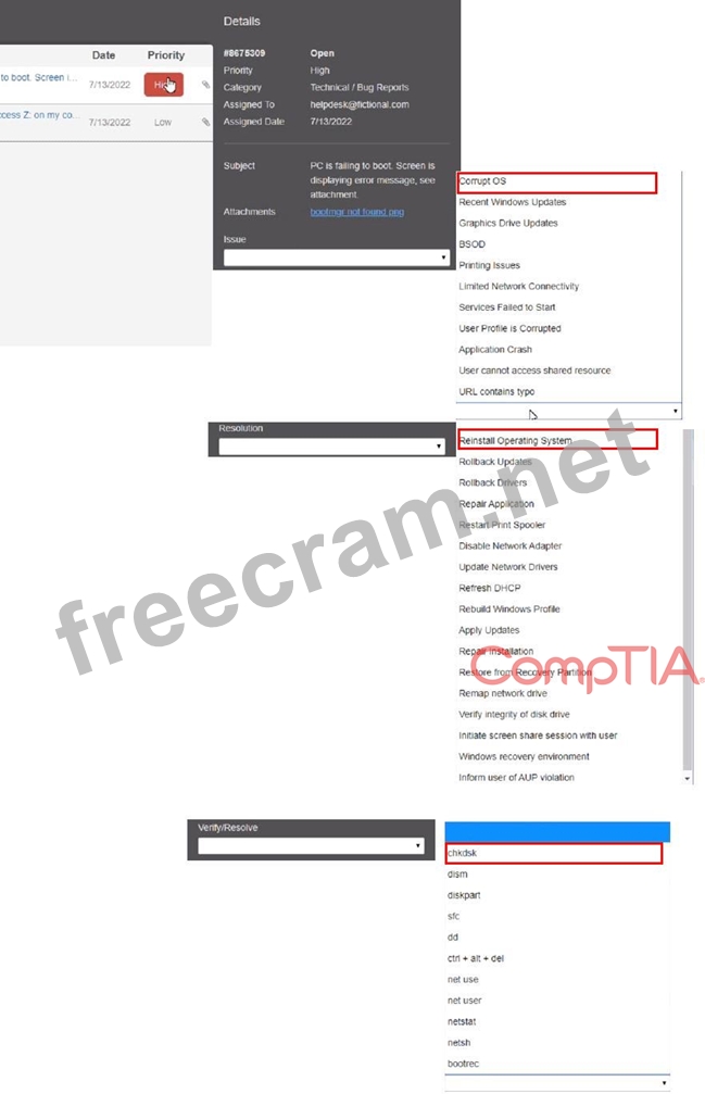 Welcome to your first day as a Fictional Company. LLC helpdesk employee. Please work the tickets in your helpdesk ticket queue. Click on individual tickers to see the ticket details. View attachments to determine the problem. Select the appropriate issue from the 'issue' drop-down menu. Then, select the MOST efficient resolution from the 'Resolution' drop-down menu. Finally, select the proper command or verification to remediate or confirm your fix of the issue from the Verify Resolve drop-down menu.