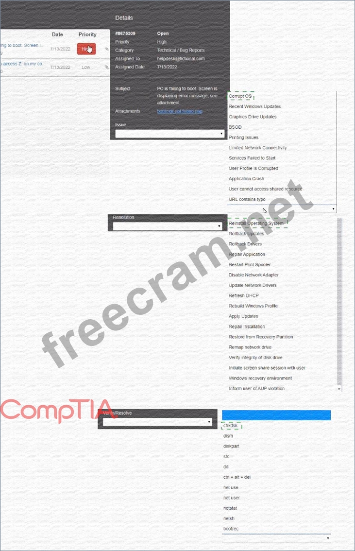 Select the appropriate issue from the 'issue' drop-down menu. Then, select the MOST efficient resolution from the 'Resolution' drop-down menu. Finally, select the proper command or verification to remediate or confirm your fix of the issue from the Verify Resolve drop-down menu.
