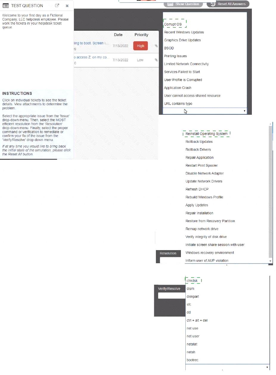 Select the appropriate issue from the 'issue' drop-down menu. Then, select the MOST efficient resolution from the 'Resolution' drop-down menu. Finally, select the proper command or verification to remediate or confirm your fix of the issue from the Verify Resolve drop-down menu.