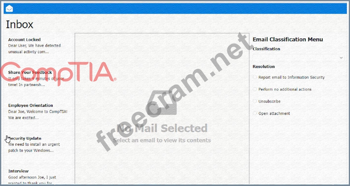 The appropriate resolution for this email is A. Report email to Information Security. The user should not click on the link, reply to the email, or provide any personal or account information. The user should forward the email to the Information Security team or use a professional email form to report the phishing attempt. The user should also delete the email from their inbox and trash folder.