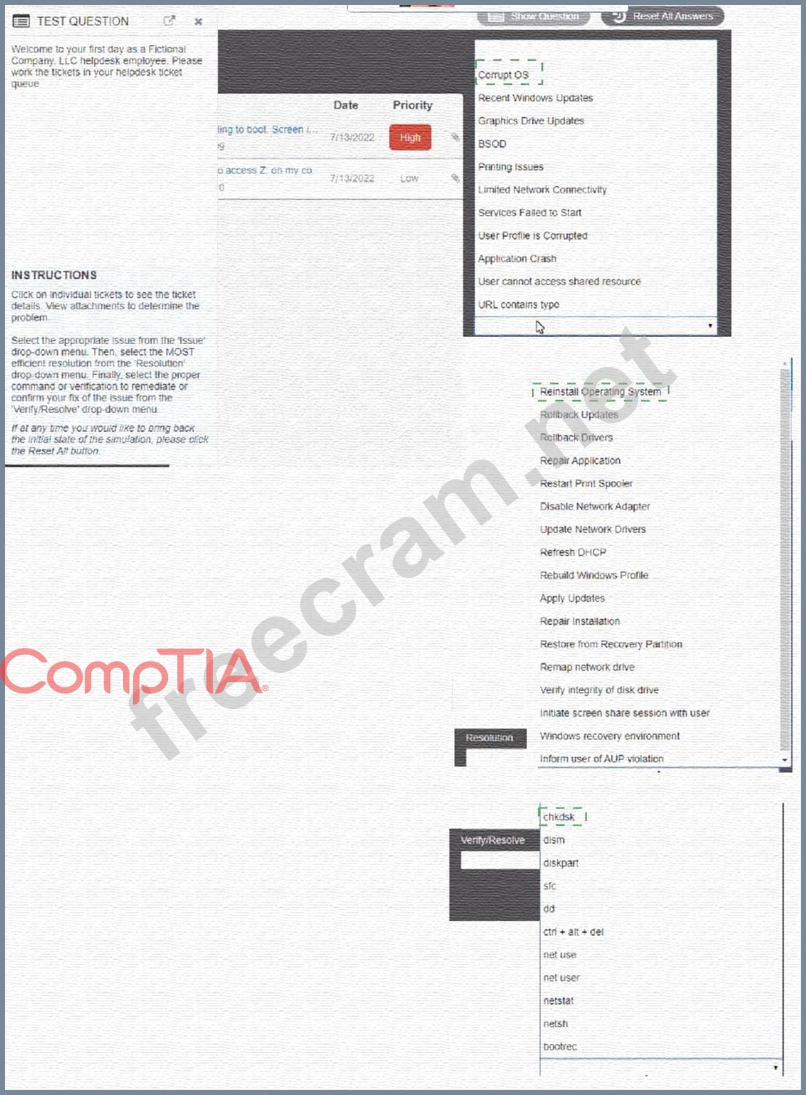Select the appropriate issue from the 'issue' drop-down menu. Then, select the MOST efficient resolution from the 'Resolution' drop-down menu. Finally, select the proper command or verification to remediate or confirm your fix of the issue from the Verify Resolve drop-down menu.