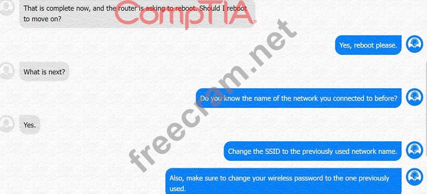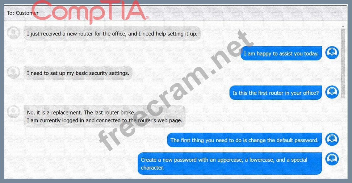 You have been contacted through the help desk chat application. A user is setting up a replacement SOHO router. Assist the user with setting up the router. INSTRUCTIONS Select the most appropriate statement for each response. Click the send button after each response to continue the chat. If at any time you would like to bring back the initial state of the simulation, please click the Reset All button.