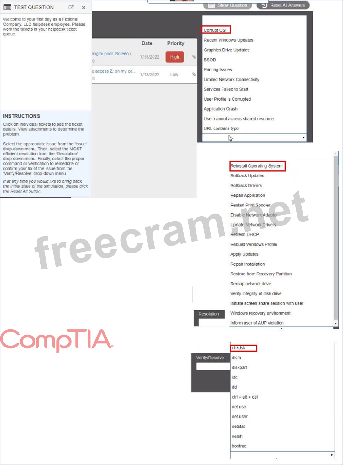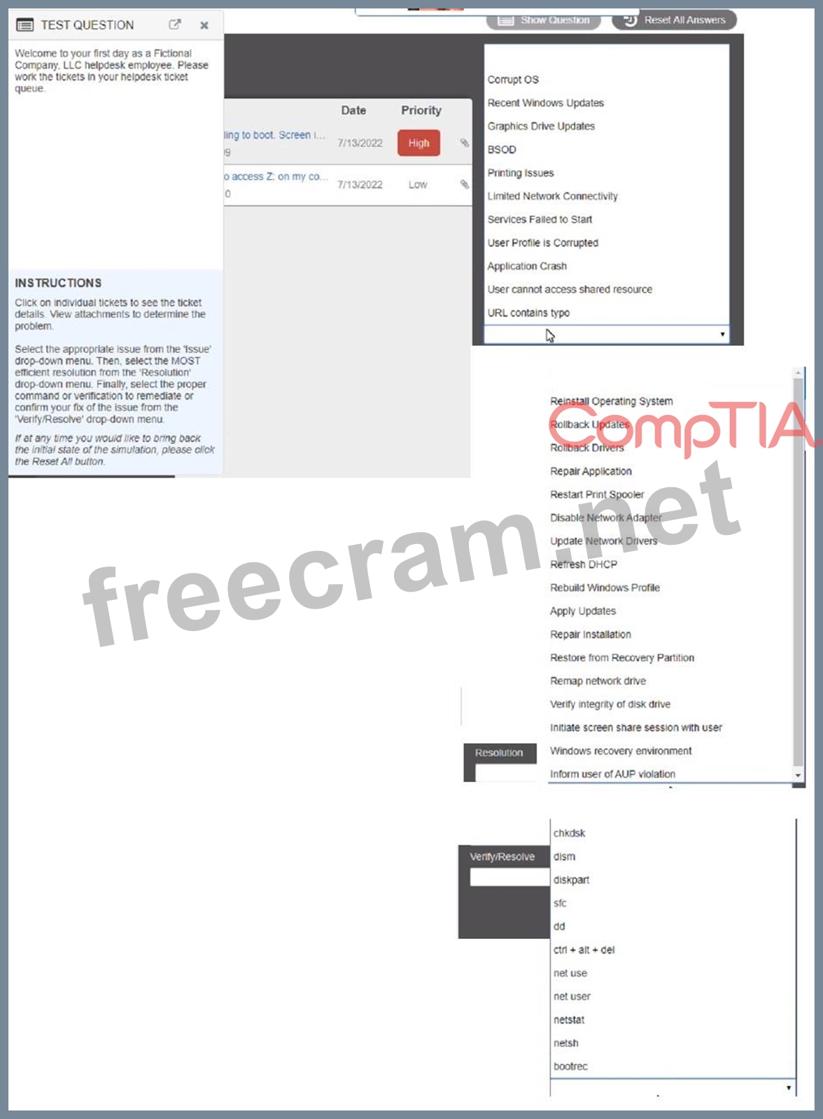 Select the appropriate issue from the 'issue' drop-down menu. Then, select the MOST efficient resolution from the 'Resolution' drop-down menu. Finally, select the proper command or verification to remediate or confirm your fix of the issue from the Verify Resolve drop-down menu.