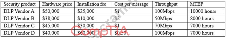 A newly hired Chief Information Security Officer (CISO) is reviewing the organization's security budget from the previous year. The CISO notices $100,000 worth of fines were paid for not properly encrypting outbound email messages. The CISO expects next year's costs associated with fines to double and the volume of messages to increase by 100%. The organization sent out approximately 25,000 messages per year over the last three years. Given the table below: