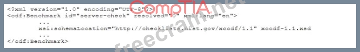 An engineer wants to assess the OS security configurations on a company's servers. The engineer has downloaded some files to orchestrate configuration checks When the engineer opens a file in a text editor, the following excerpt appears: