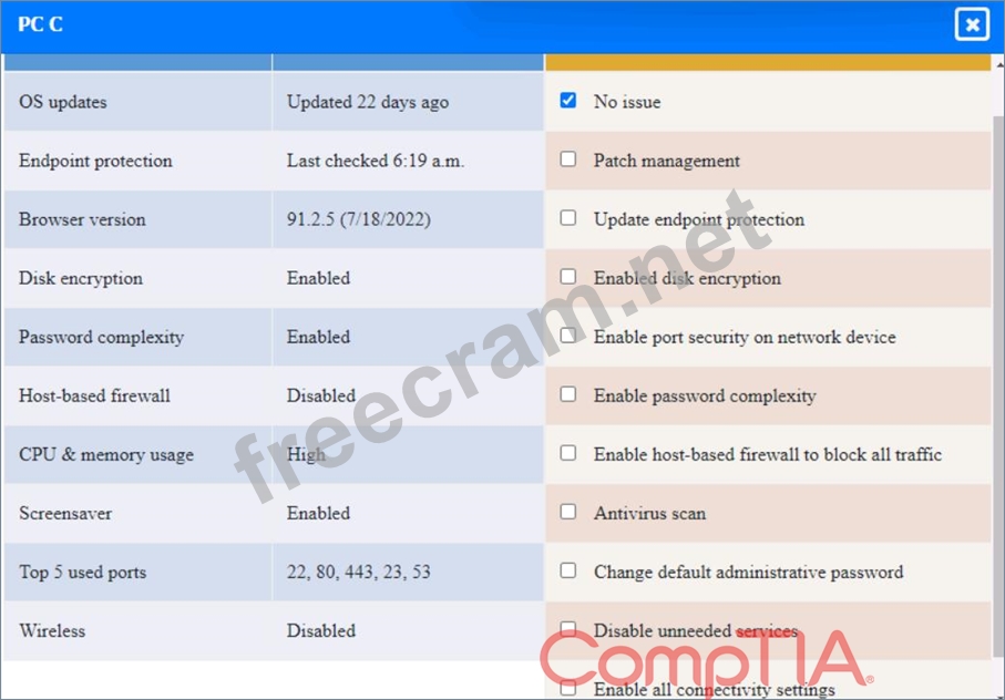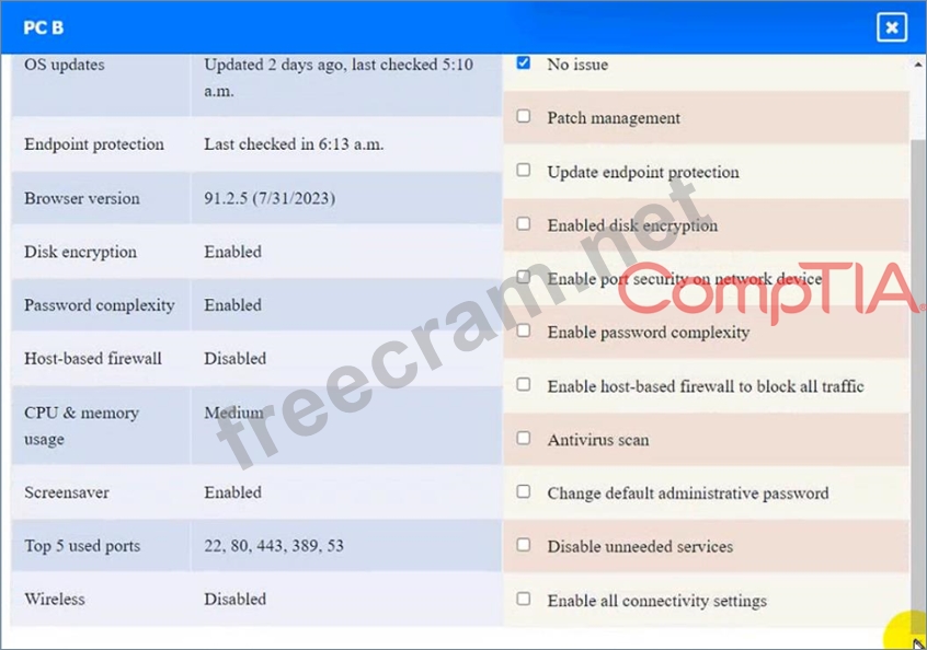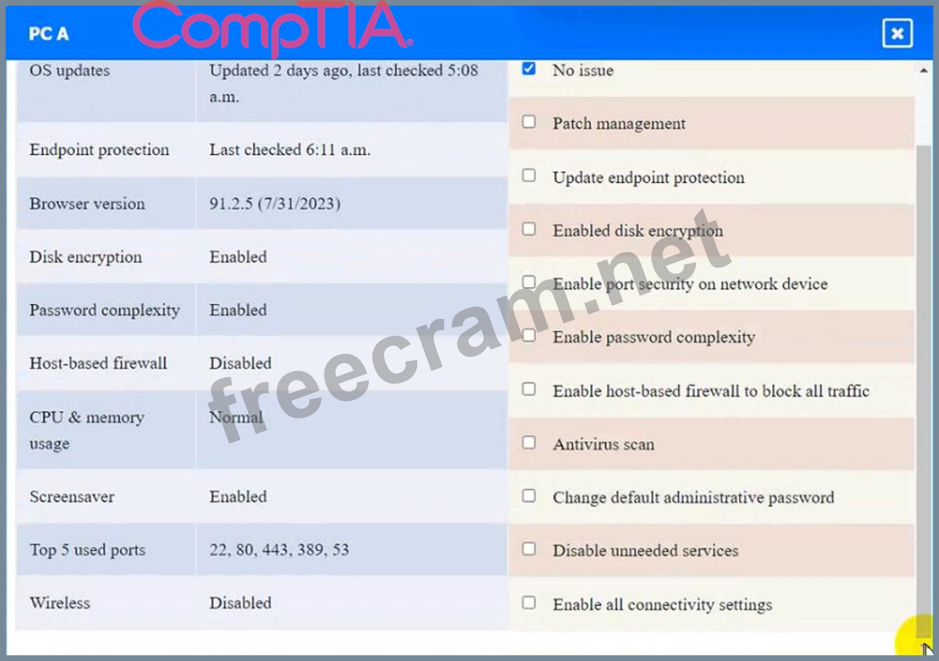 This option will turn off the host-based firewall and allow all traffic to pass through. This will comply with the requirement and also improve the connectivity of PC A to other devices on the network. However, this option will also reduce the security of PC A and make it more vulnerable to attacks. Therefore, it is recommended to use other security measures, such as antivirus, encryption, and password complexity, to protect PC A from potential threats.