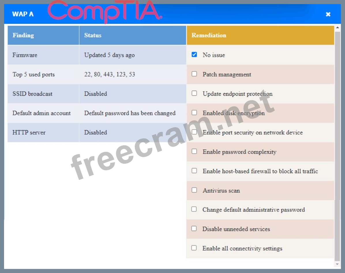 WAP A: No issue found. The WAP A is configured correctly and meets the requirements.