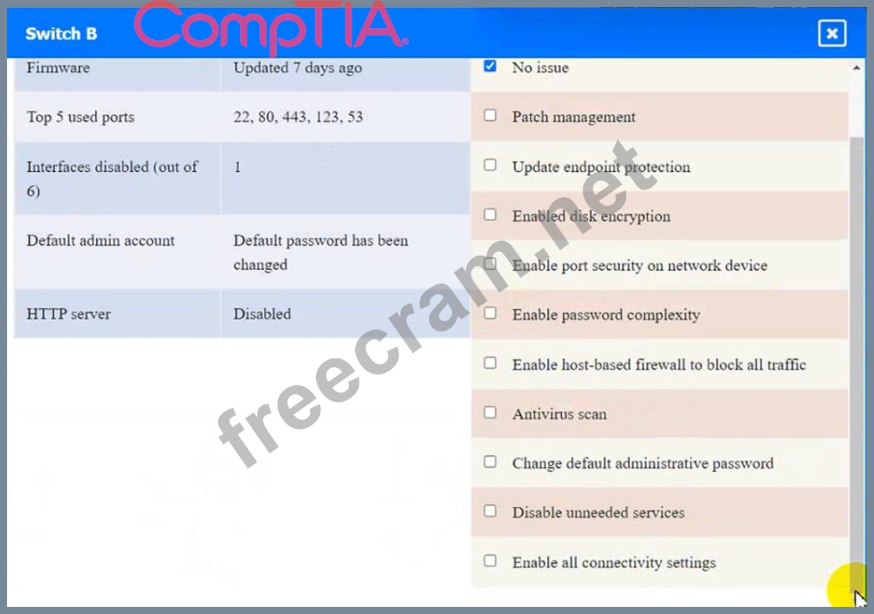 Switch B: No issue found. The Switch B is configured correctly and meets the requirements.
