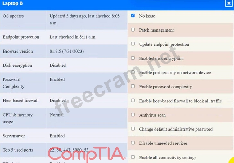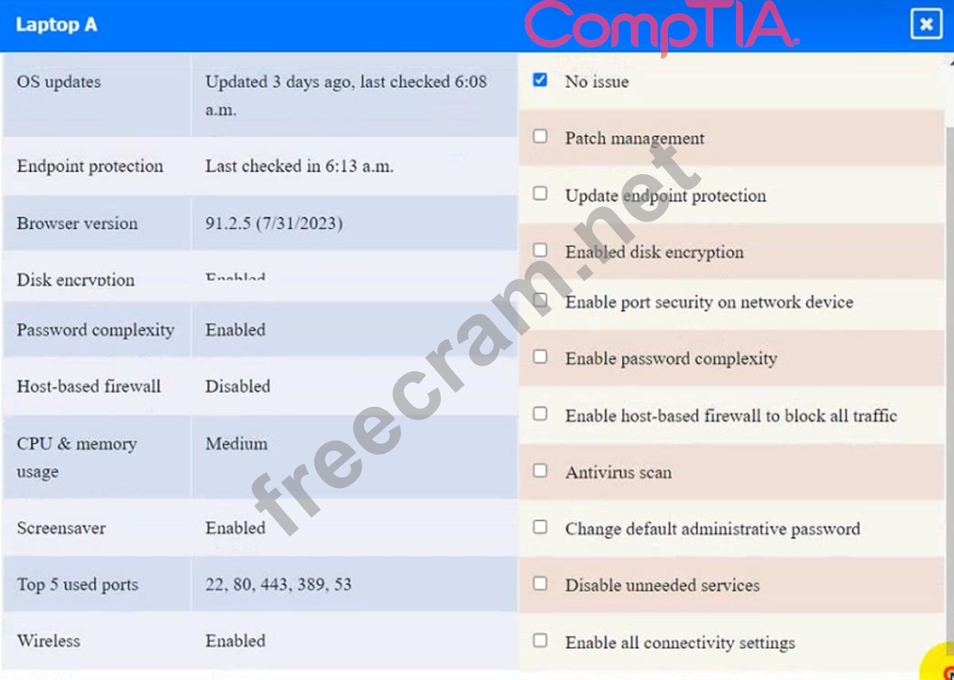 This option will install the updates that are available for Laptop A and ensure that it has the most recent security patches and bug fixes. This will comply with the requirement and also improve the performance and stability of Laptop A. However, this option may also require a reboot of Laptop A and some downtime during the update process. Therefore, it is recommended to backup any important data and close any open applications before applying the updates.