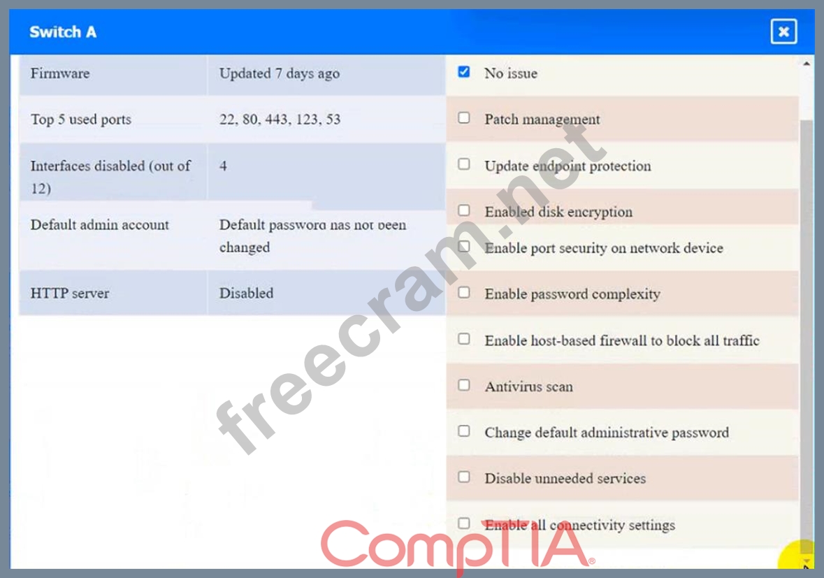 Switch A: No issue found. The Switch A is configured correctly and meets the requirements.