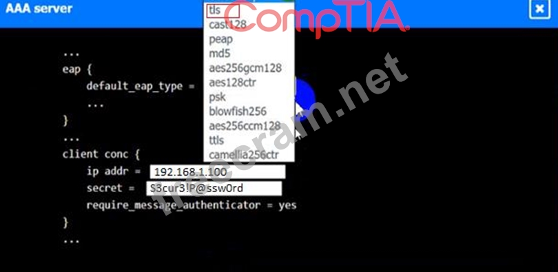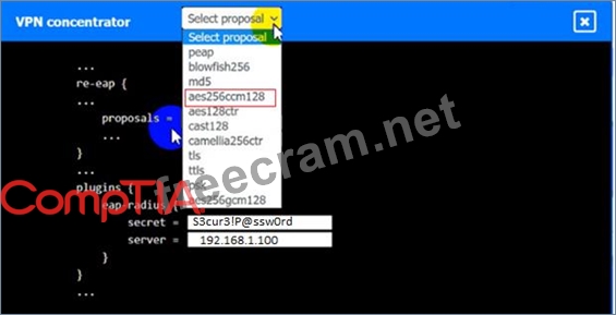 An IPSec solution is being deployed. The configuration files for both the VPN concentrator and the AAA server are shown in the diagram.