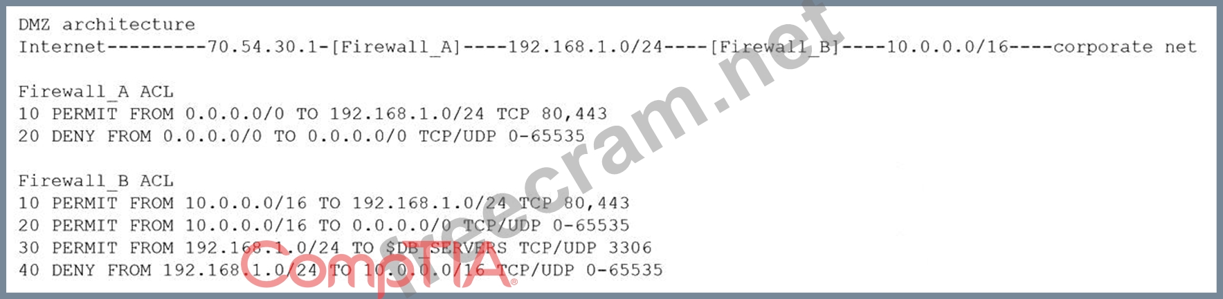 A security architect is reviewing the following proposed corporate firewall architecture and configuration: