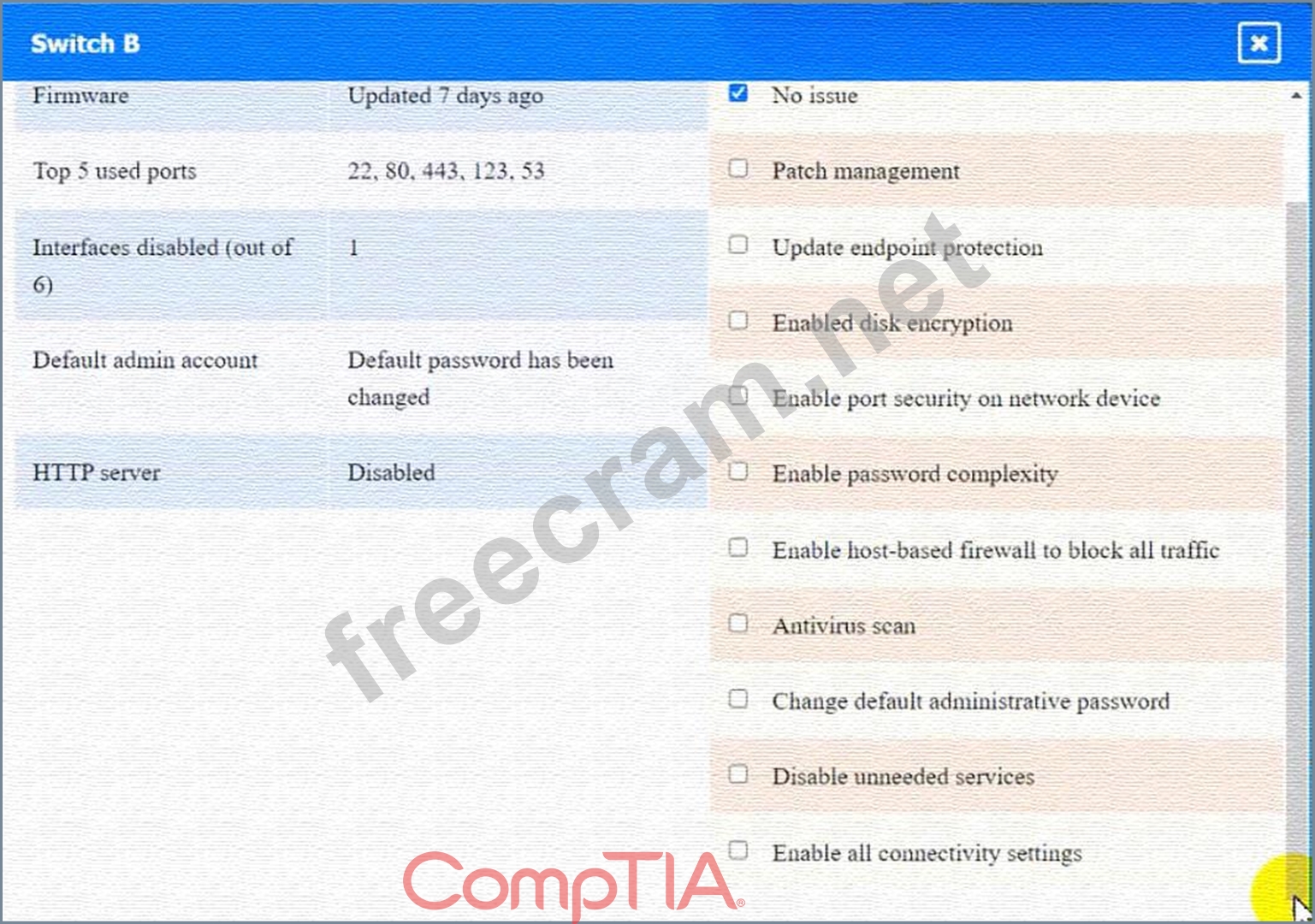 Switch B: No issue found. The Switch B is configured correctly and meets the requirements.