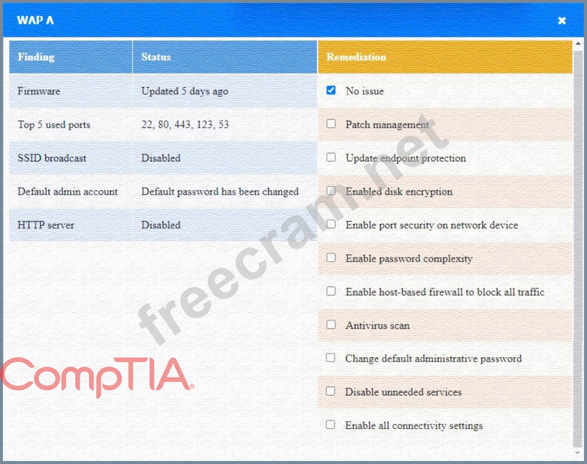 WAP A: No issue found. The WAP A is configured correctly and meets the requirements.