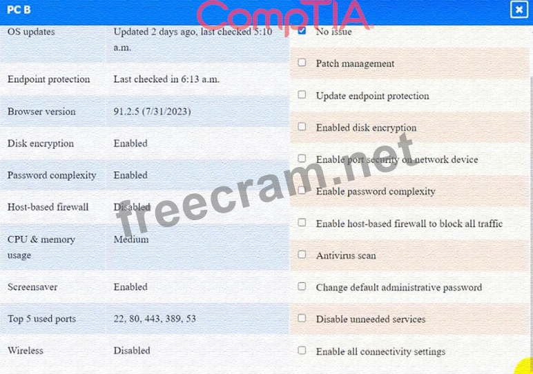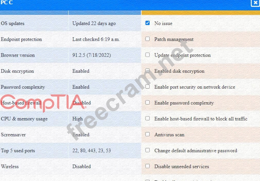 This option will turn off the host-based firewall and allow all traffic to pass through. This will comply with the requirement and also improve the connectivity of PC A to other devices on the network. However, this option will also reduce the security of PC A and make it more vulnerable to attacks. Therefore, it is recommended to use other security measures, such as antivirus, encryption, and password complexity, to protect PC A from potential threats.