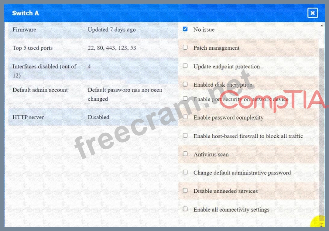 Switch A: No issue found. The Switch A is configured correctly and meets the requirements.