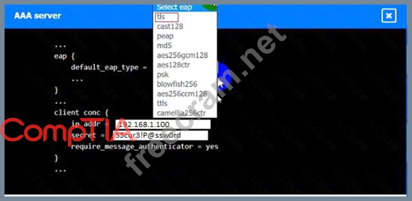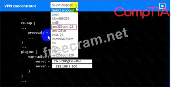 An IPSec solution is being deployed. The configuration files for both the VPN concentrator and the AAA server are shown in the diagram.
