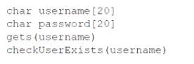 The code snippet presents a buffer size risk where the user input (username) is accepted without limiting the number of characters, potentially leading to buffer overflow vulnerabilities. The best solution is to implement input validation that limits the input to a maximum of 20 characters, matching the buffer size defined in the code. This prevents overflow attacks by ensuring that user input does not exceed the allocated memory space. Other options, like adding more parameters or allowing alphanumeric characters, do not directly address the root cause of buffer overflow vulnerabilities. CASP+ stresses the importance of proper input validation and bounds checking as critical security measures. References: * CASP+ CAS-004 Exam Objectives: Domain 2.0 - Enterprise Security Operations (Input Validation and Buffer Overflow Prevention) * CompTIA CASP+ Study Guide: Secure Coding Practices and Input Validation Techniques