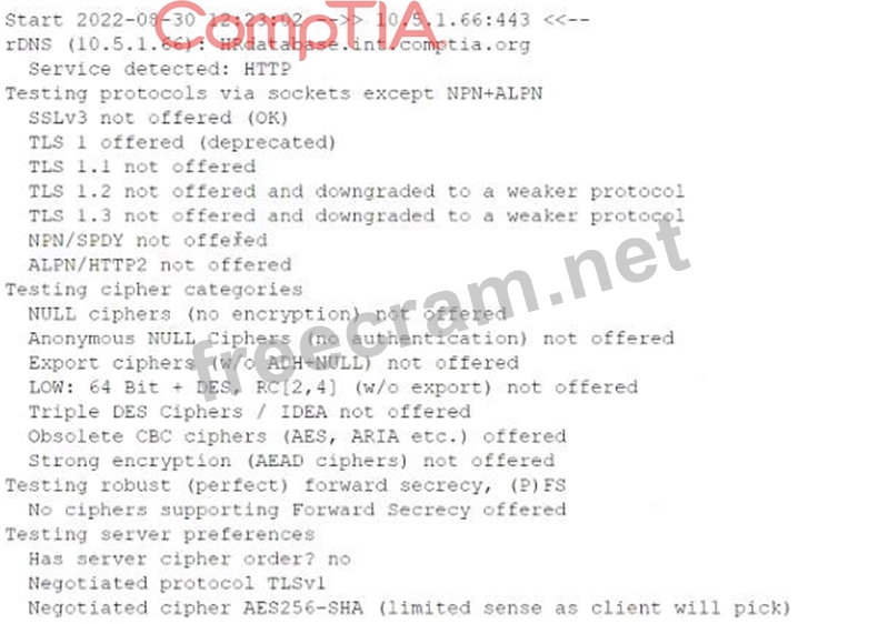 Based on the output in the image, which shows weak cipher suites and vulnerabilities related to encryption padding, the padding oracle attack is the most likely. This type of attack exploits the way padding errors are handled during decryption, potentially allowing an attacker to decrypt sensitive information. The weak cipher suites and lack of forward secrecy further increase the likelihood of such an attack succeeding. CASP+ highlights padding oracle attacks as critical vulnerabilities, particularly in environments where weak encryption protocols are used. References: * CASP+ CAS-004 Exam Objectives: Domain 2.0 - Enterprise Security Operations (Encryption and Padding Oracle Attacks) * CompTIA CASP+ Study Guide: Cryptographic Attacks and Cipher Vulnerabilities