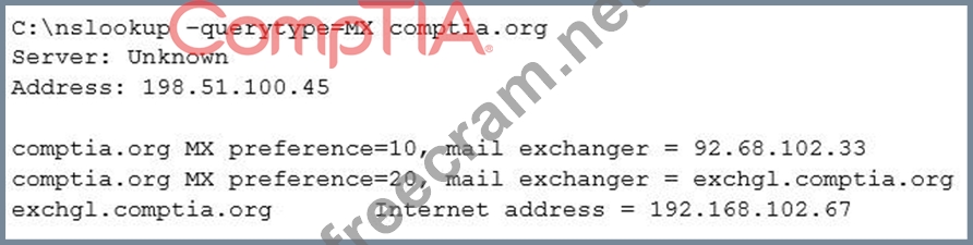 Answer B is incorrect, there's no information about the server version Answer C is incorrect, there's no SPF records here Answer D is incorrect. Usually the secondary MX record is simply a different route to the same server. Answer A is correct, 192.168.x.x is a private IP address and should not be displayed publicly.