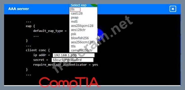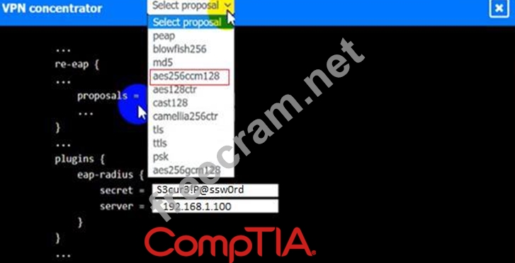 An IPSec solution is being deployed. The configuration files for both the VPN concentrator and the AAA server are shown in the diagram.
