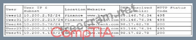 Sinkholing, or DNS sinkholing, is a method used to redirect malicious traffic to a safe destination. This technique is often employed by security teams to prevent access to malicious domains by substituting a benign destination IP address. In the given logs, users from the finance department are accessing www.bank.com and receiving HTTP status code 495. This status code is typically indicative of a client certificate error, which can occur if the DNS traffic is being manipulated or redirected incorrectly. The consistency in receiving the same HTTP status code across different users suggests a systematic issue rather than an isolated incident. * Recursive DNS resolution failure (A) would generally lead to inability to resolve DNS at all, not to a specific HTTP error. * DNS poisoning (B) could result in users being directed to malicious sites, but again, would likely result in a different set of errors or unusual activity. * Incorrect DNS setup (D) would likely cause broader resolution issues rather than targeted errors like the one seen here. By reviewing the provided data, it is evident that the DNS traffic for www.bank.com is being rerouted improperly, resulting in consistent HTTP 495 errors for the finance department users. Hence, the most likely cause is that the DNS traffic is being sinkholed. References: * CompTIA SecurityX study materials on DNS security mechanisms. * Standard HTTP status codes and their implications.