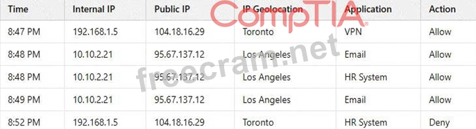 A user reports application access issues to the help desk. The help desk reviews the logs for the user:
